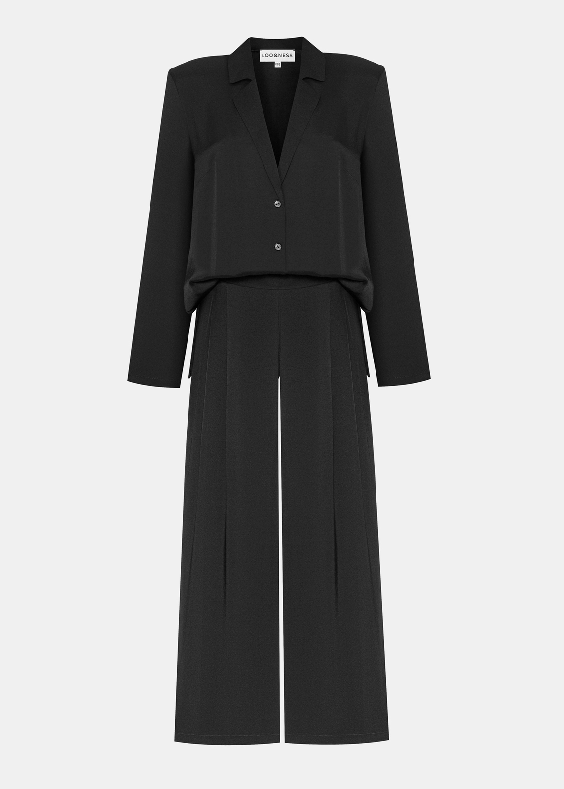 - Bluse im Hemdblusenstil mit exklusiven Hornknöpfen zum Verschließen. Die Hose hat einen leicht erhöhten Bund und einen weiten Schnitt, der die Silhouette umspielt.